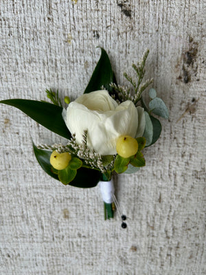 Boutonniere designed with garden flowers and greens. If for an event or prom please let us know your suit or shirt color in the comment section and any other flower color preferences. Delivery not available.