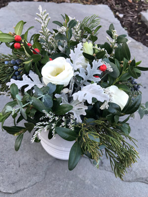 Christmas arrangements are done with a mix of greens, flowers and other texture elements like berries and pinecones. The greens if watered can last up to 4 weeks+. Please put in comments any color requests and date you would like to pick up or have delivered.
